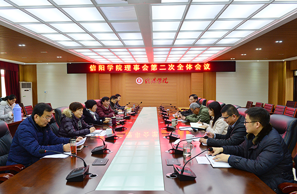 12月27日下午,适值辞旧迎新之际,信阳学院理事会在行政楼208会议室召开了第二次全体会议,学习贯彻党的十八届六中全会和全国高校思想政治工作会议精神,审定《信阳学院“十三五”事业发展规划纲要》,研究有关工作方案。理事长高云,理事施昌海、张莉、傅洪涛、杨高伟、高雅、傅瑛、陈录生、王章力等出席会议。副校长王志华、毛海涛等列席会议。
