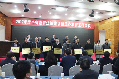 会议依据不久前省教育厅出台的《关于表彰第五批依法治校示范校的决定》和《关于表彰2016年度河南省优秀民办学校民办教育先进单位和先进个人的决定》等文件,为获奖单位和个人颁发了奖牌。毛海涛代表我校领取了“2016年度河南省优秀民办学校”奖牌。