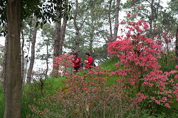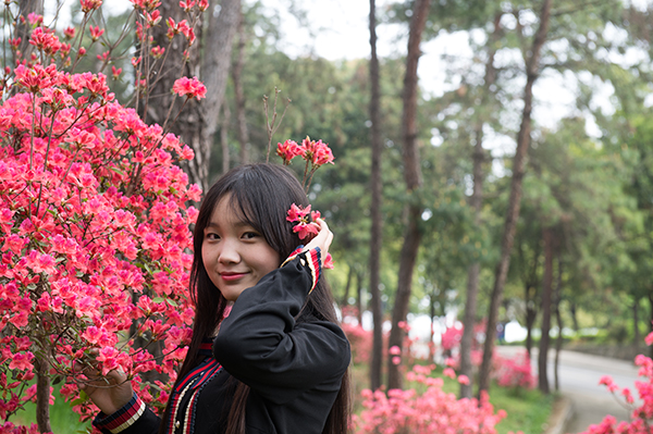 在河南、湖北两地,人们习惯于将野生或人工培植的杜鹃称为“映山红”。每到清明节前后,周末去哪里踏青是人们关注最多的话题。一家老小伴着舒缓的乐曲驾车或惬意步行徜徉在山间林荫道上,若忽然看见茂翠的丛林中的那一簇红,驻足观赏是必须的,回眸凝望不忍离开只因她美的让人不舍。在城市里,你可曾见过一株株近在咫尺、花团锦簇的映山红?若是你来到信阳,置身于杜鹃正开得如火如荼的信阳学院,你会发现,这些杜鹃正在努力绽放,用她们的鲜艳来装点校园。这正是“最是一年春好处,信院杜鹃分外红。”学校的多片森林都被这美丽的杜鹃装扮得分外妖娆。