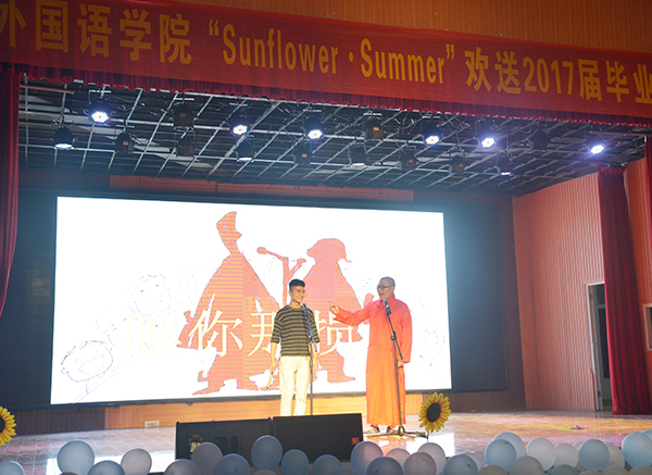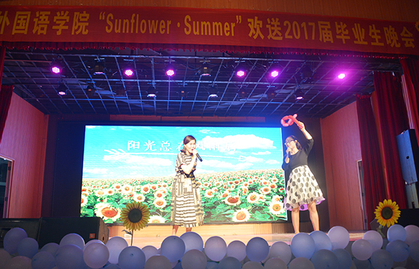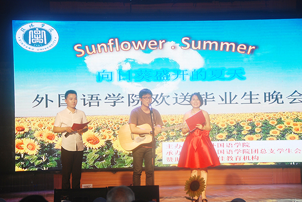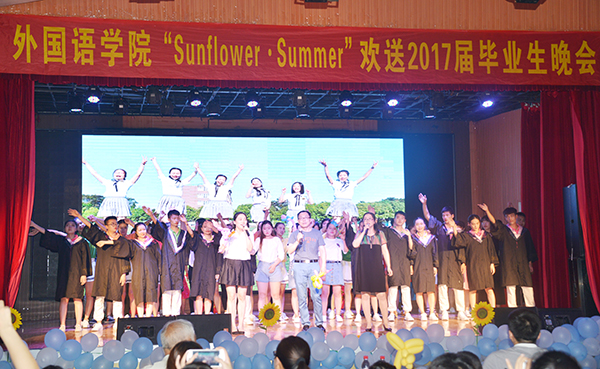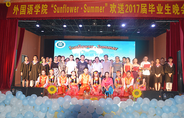 5月22日晚,外国语学院“Sunflower • Summer”欢送2017届毕业生文艺晚会在大学生活动中心举行。校长施昌海、校长助理杨高伟、社会科学学院院长陈录生、外国语学院院长罗德喜和600余名师生共同观看了晚会。