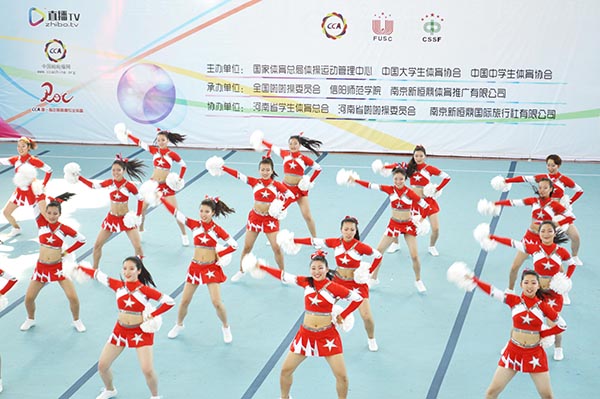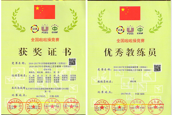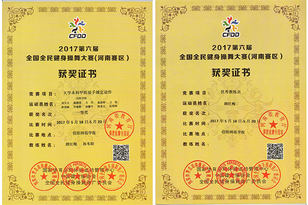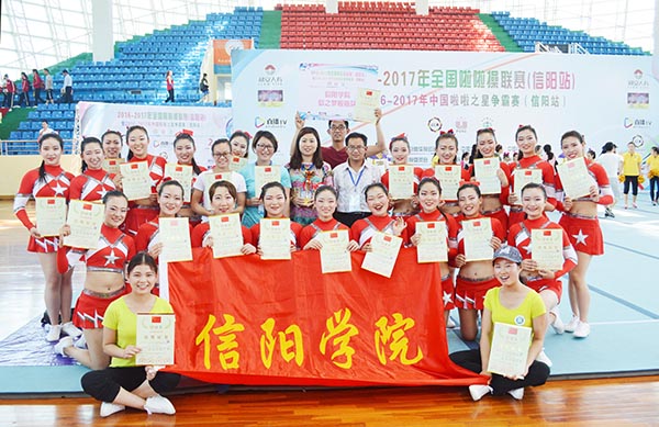 5月16-20日,2016-2017年全国啦啦操联赛(信阳站)和2017年全国全民健身操舞大赛(河南赛区)暨第六届河南省学生健身操舞锦标赛在信阳师范学院隆重举行。本次全国啦啦操联赛由国家体育总局体操运动管理中心、中国大学生体育协会和河南省教育厅共同主办。全国健身操舞大赛由国家体育总局体操运动管理中心、中国健美操协会和河南省教育厅共同主办。两场比赛均由信阳师范学院承办,有90所学校,100支队伍,共计2000余人参赛。我校勇夺啦啦操规定动作两项冠军,全民健身操舞大学本科甲组徒手规定动作一等奖。