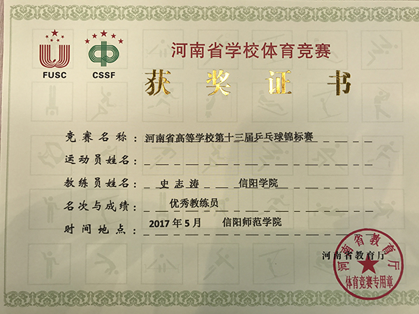 5月29日至6月4日,河南省第十三届大学生乒乓球锦标赛在信阳师范学院举行。我校派出了由公体部史志涛老师和商学院苏畅、外国语学院陈铭、理工学院王菁、社会科学学院鞠凡等4名同学组成的代表队参赛。经过6天的激烈角逐,我校代表队获得女子甲组双打冠军、团体亚军,以及女子单打第五名和第七名的喜人成绩。史志涛荣获“优秀教练员”称号,苏畅荣获“优秀运动员”称号。