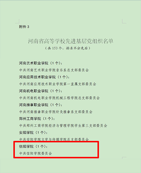 日前,中共河南省委高校工委、中共河南省教育厅党组下发《关于表彰全省高等学校优秀共产党员、优秀党务工作者和先进基层党组织的决定》(豫高发〔2017〕76号),对全省高等教育领域先进基层党组织、优秀共产党员、优秀党务工作者予以表彰。其中,我校党委喜获“全省高等学校先进基层党组织”称号,万建章同志荣获“全省高等学校优秀共产党员”称号,胡志国同志荣获“全省高等学校优秀党务工作者”称号。