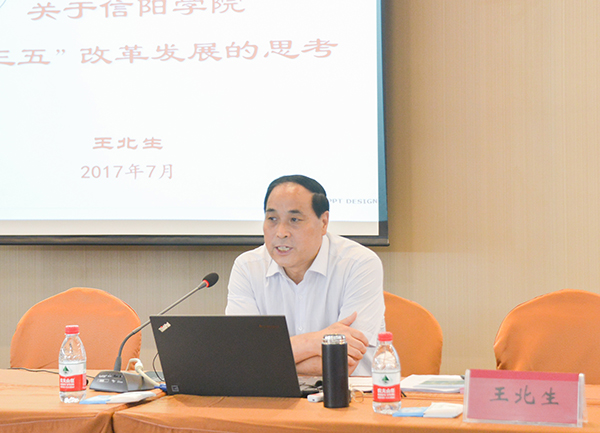 开班式上,王北生作了《关于学校“十三五”改革发展的思考》主题报告。他精炼地总结了学校转设更名以来取得的办学成果,紧扣“有什么、缺什么、想什么、干什么、怎么干”五个问题,指出了学校办学历程中的优势经验,客观地分析了当前实现学校从稳步到跨越发展亟需解决的问题;提出通过狠抓硬件建设、教师队伍、科研水平、品牌专业、特色凝练、教学改革、就业质量、科学管理、制度建设等“九个方面”的工作,坚持“四用”理念和“四个发展”,实施“12345”工程,即“一个目标两个关键三个重点四个突破五个保障”,力争把学校建成“突出应用性、具有综合性,社会声誉好、富有地方特色,在省内外具有先进地位的一流高水平民办大学”。