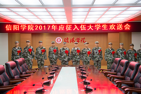 近年来,学校理事会和各位领导对征兵工作高度重视,大力支持。为了深入落实大学生应征入伍政策,学工部、人民武装部与各学院一起,认真组织、精心动员,做好大学生参军入伍工作。在新生入校前,印制《大学新生应征入伍宣传单》和新生录取通知书一起寄送到学生手中;利用辅导员主题班会和学习生活导师制等方式进行征兵政策宣传;邀请驻信的部队官兵和往届退伍大学生为学生介绍军营生活,分享参军经历。在学期初制订了征兵工作计划,并联合浉河区武装部进行了第一批大学生应征入伍现场政策咨询活动,多措并举,做好服务工作。目前,我校4000余名男生全部完成兵役登记,网上报名133人,76人参加体检,最终37人通过层层选拔成为光荣的人民解放军战士,使我校2017年征兵工作迈向新台阶。