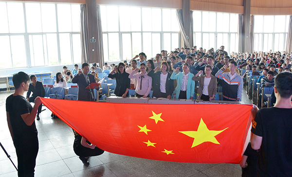 人事处负责人李青峰带领全体新教师面向国旗,进行了庄严的入职宣誓仪式。