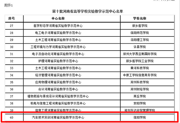 近日,河南省教育厅下发了《关于公布第十批河南省高等学校实验教学示范中心和2017年河南省高等学校虚拟仿真实验中心名单的通知》(教办高〔2017〕799号),我校汽车技术实训中心成功获批为第十批河南省高等学校实验教学示范中心。这是本中心继获得河南省高等学校“专业综合改革试点”项目、信阳市汽车排放与控制工程技术研究中心之后的又一项重大突破。