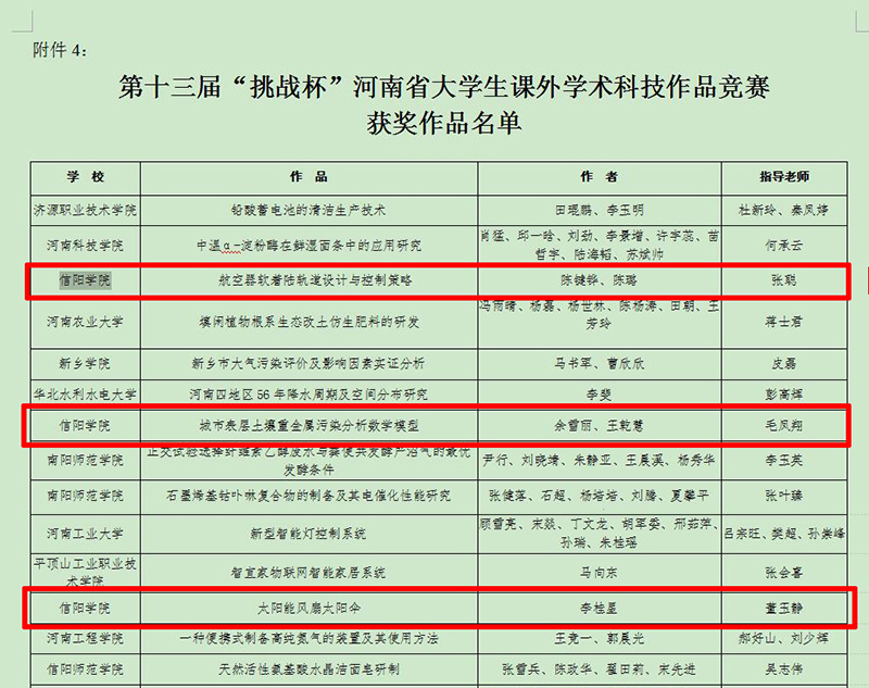 日前,共青团河南省委公布了第十三届“挑战杯”河南省大学生课外学术科技作品竞赛成绩,我校共有三项作品获奖。由张聪任指导教师,学生陈键铧、陈璐的作品《航空器软着陆轨道设计与控制策略》荣获二等奖;由毛凤翔任指导教师,余雪丽、王乾慧的作品《城市表层土壤重金属污染分析数学模型》荣获三等奖;由董玉静任指导教师,学生李桂星的作品《太阳能风扇太阳伞》荣获三等奖。