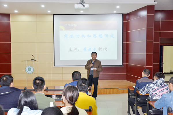 10月11日上午,河南工业大学法学院院长黄建水教授应邀在图书馆102学术报告厅作了题为《宪法的共和思想研究》 的学术报告。社会科学学院200多名师生聆听了报告会。副校长毛海涛主持了报告会。