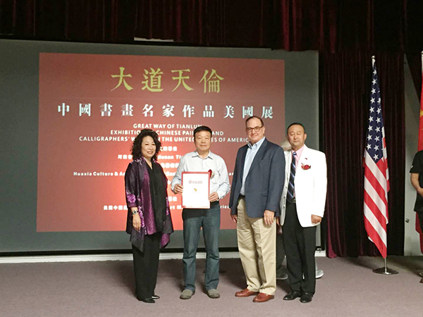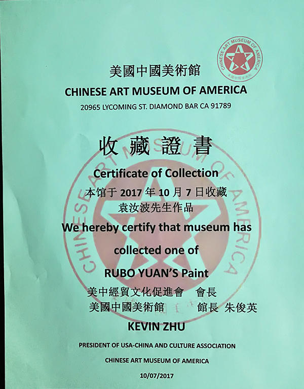 开幕式上,袁汝波教授接受了由加州共和党前领袖参议员Bob Huff 及夫人何美湄女士颁发的贺状,以及美国中国美术馆颁发的作品收藏证书。