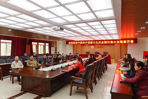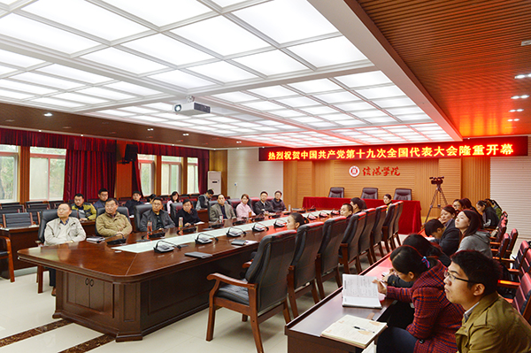 在学校行政楼208会议室,名誉校长王北生,专职书记施昌海,常务副校长傅洪涛,副校长王志华、毛海涛,理事会理事、工会主席高雅,纪委书记杨高伟和近百名机关干部及学生党员代表集中观看了十九大开幕会直播盛况。在各学院会议室、教研室、实验室,有关党员干部和师生代表分别集中观看大会直播盛况。众多师生通过学校大屏幕及手机等观看大会直播盛况。