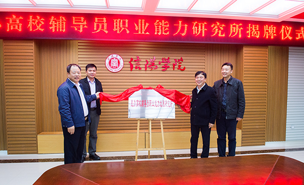 李培俊、徐军保、施昌海和王志华共同为民办高校辅导员职业能力发展研究中心揭牌。