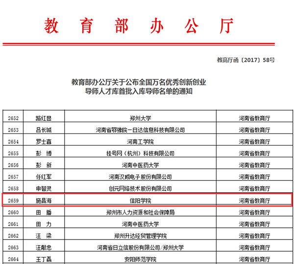 施昌海教授近年来积极指导我校创新创业工作,完成多项就业创业课题和论文,在制度设计、教育教学、项目实践、载体建设等方面给予了诸多帮助,助力此项工作不断向前向好发展,并为学校赢得了良好社会声誉。全国万名优秀创新创业导师人才库的设立,并吸收我校专家入库,必将进一步为我校创新创业工作提供重要业务指导,促进我校不断提升创新创业教育工作水平和人才培养质量。