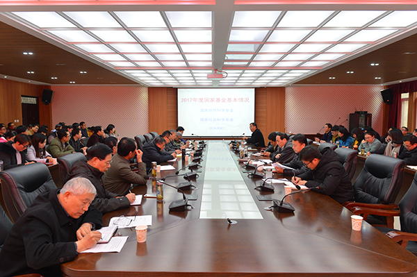 毛海涛在会上介绍了2017年度国家自然科学基金和国家社科基金的基本情况,以及2018年度国家基金项目申报工作相关背景、流程及要求。