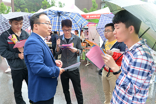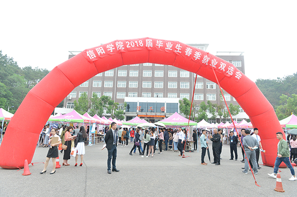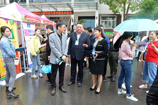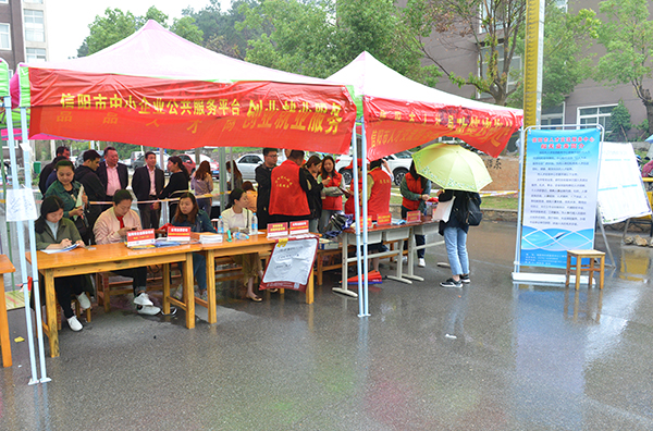 5月5日,时值立夏,我校2018届大型毕业生就业双选会在理工楼广场隆重举行。上午9时许,一场喜雨不期而遇,来自省内外各地企业负责人和信阳市人社局党组成员、市人才交流中心主任周晴,我校专职副书记施昌海,副校长王志华、毛海涛,校长助理杨高伟和校长办公室、宣传部、学生工作处、招生就业处,各学院相关负责人,冒雨进入双选会现场,指导和参与双选工作。市、校有关领导不时在招聘展位上驻足,与用人单位和毕业生亲切交流,了解用人单位的需求和招聘进展等情况,询问各单位今年的招聘计划及我校往届毕业生在各单位的工作表现,并热情慰问了招生就业处和各学院的工作人员以及学生志愿者。