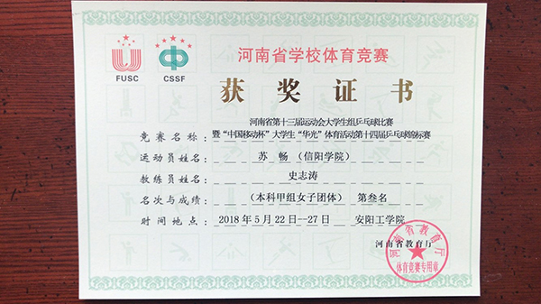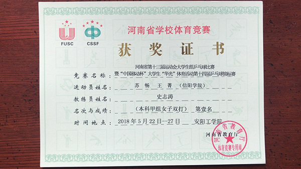 5月21日至27日,河南省第十三届运动会大学生组乒乓球赛在安阳工学院举行。我校派出了由公体部史志涛老师和理工学院王菁、商学院苏畅、外国语学院曾雅倩、文学院陈鑫等4名同学组成的代表队参赛。经过6天的激烈角逐,我校代表队蝉联女子甲组双打冠军,并获女子团体季军的喜人成绩。王菁同学荣获“优秀运动员”称号,史志涛老师荣获“优秀教练员”称号。