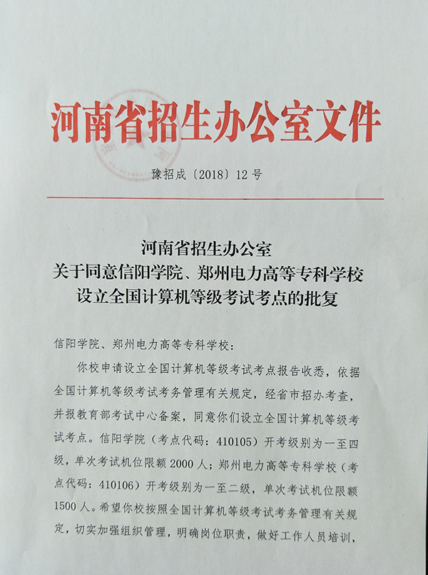 日前,河南省招生办公室下发通知,同意信阳学院设立全国计算机等级考试考点。我校成功获批为全国计算机等级考试考点,并将于2018年9月份开展首场考试。