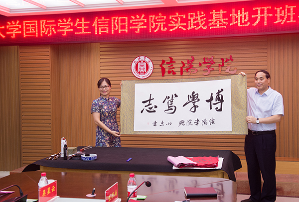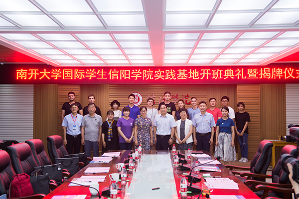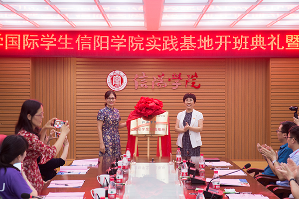 6月30日下午,南开大学国际学生信阳学院实践基地开班典礼暨揭牌仪式在行政楼208会议室举行。南开大学汉语言文化学院党委书记邢丽芳,党委副书记满荣,院长助理梁晓萍;我校理事长、校长高云,名誉校长王北生,副校长王志华、毛海涛,校长助理高雅、杨高伟等出席揭牌仪式和座谈交流活动。南开大学汉语言文化学院有关干部、教师和来自11个国家的76名国际学生,我校有关单位负责同志,外国语学院、文学院师生代表参加了交流活动。王北生主持了上述活动。