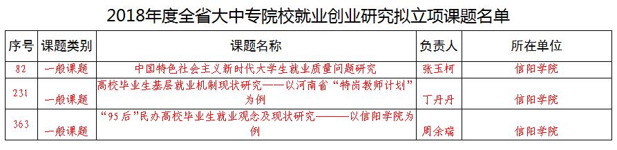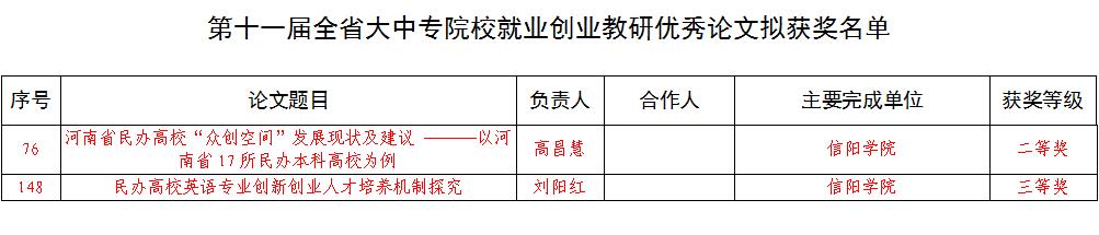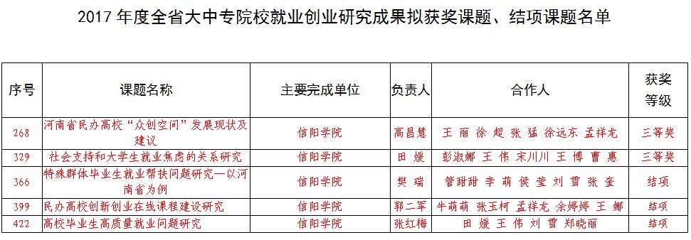 教育厅近日下文,招生就业处张玉柯主持的《中国特色社会主义新时代大学生就业质量问题研究》、社会科学学院丁丹丹主持的《高校毕业生基层就业机制现状研究——以河南省“特岗教师计划”为例》、社会科学学院周余瑞主持的《“95后”民办高校毕业生就业观念及现状研究——以信阳学院为例》获批立项;招生就业处郭二军主持的《民办高校创新创业在线课程建设研究》、理工学院张红梅主持的《高校毕业生高质量就业问题研究》、商学院高昌慧主持的《河南省民办高校“众创空间”发展现状及建议》、社会科学学院田媛主持的《社会支持和大学生就业焦虑的关系研究》、理工学院樊瑞主持的《特殊群体毕业生就业帮扶问题研究——以河南省为例》等5项课题准予结项。其中,《河南省民办高校“众创空间”发展现状及建议》和《社会支持和大学生就业焦虑的关系研究》荣获成果奖三等奖;商学院高昌慧撰写的《河南省民办高校“众创空间”发展现状及建议——以河南省17所民办本科高校为例》和外国语学院刘阳红撰写的《民办高校英语专业创新创业人才培养机制探究》分别荣获第十一届优秀论文二等奖和三等奖。