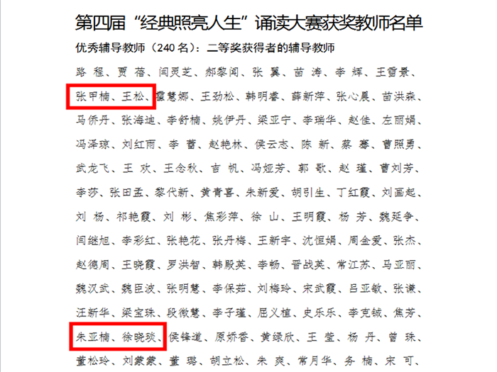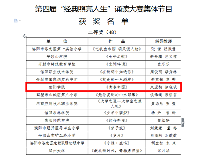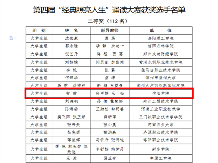 近日,河南省教育厅公布了第四届“经典照亮人生”诵读大赛评选结果,我校选送的作品分别获得集体组二等奖、大学生组二等奖,参赛学生贺苗获得奖励,张甲楠、王松、徐晓炎、朱亚楠4位教师获得优秀指导教师荣誉称号。