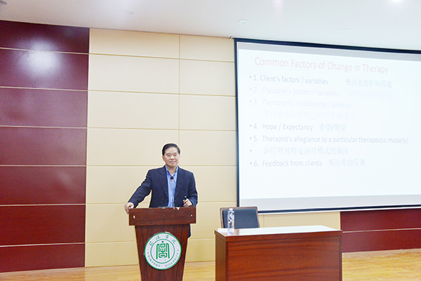 10月23日下午,新加坡新跃社科大学沈德金(Dr Charles Sim)教授应邀在图书馆102学术报告厅作了题为《心理治疗师的自我修养(POTT)培养的整合》专题报告。社会科学学院党总支书记李赟和200余名心理学专业师生聆听了报告会。社会科学学院院长助理胡志国主持了报告会。