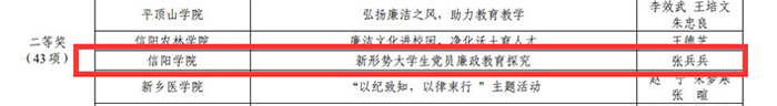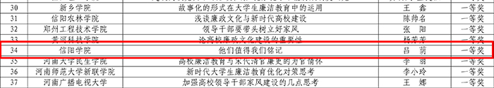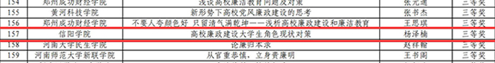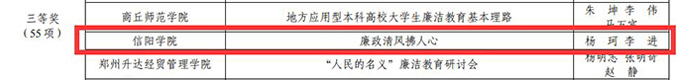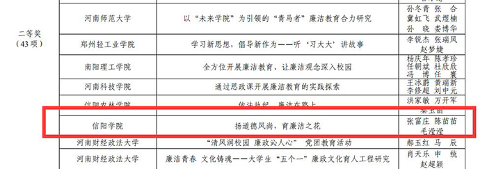 近日,中共河南省委高校工委、河南省教育厅印发了《关于公布2018年度全省高校廉政文化建设征文活动评选结果的通知》[2018]984号和《关于公布2018年度全省高校廉洁教育优秀案例征集评选活动结果的通知》[2018]1001号,我校师生的廉政文化征文和廉洁教育案例在评选活动中获得佳绩。其中,我校理工学院学生吕荫的《他们值得我们铭记》获廉政征文一等奖,外国语学院教师杨泽楠的《高校廉政建设大学生角色现状对策》获廉政征文三等奖;商学院教师张富庄、陈苗苗、毛滢滢的《扬道德风尚,育廉洁之花》和外国语学院教师张兵兵的《新形势大学生党员廉政教育探究》分别获得廉洁教育案例二等奖,社会科学学院教师李进、学生杨珂的《廉政清风拂人心》获廉洁教育案例三等奖。