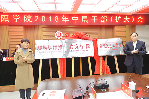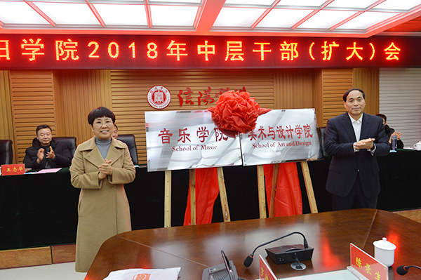 在热烈的气氛下,高云、王北生共同为教育学院、马克思主义学院、大数据和人工智能学院,以及此前成立的美术与设计学院、音乐学院揭牌。