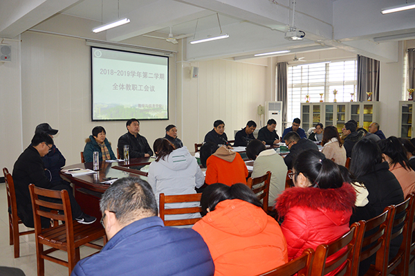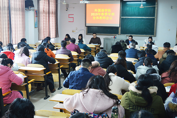 外国语学院及时召开全院教职工大会,学习贯彻学校新学期工作要点,对本学期教学质量提升,讲师以上青年教师专业技术职称提升培养计划,高层次人才引进,英语四六级、专业四八级过关率提升,学生教育管理,党建与宣传思想工作等,进行了全面安排。