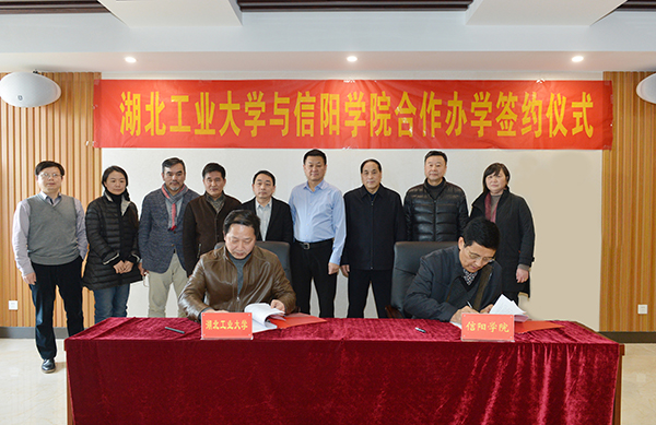 在热烈的气氛下,吴巍与傅洪涛共同签署了湖北工业大学与信阳学院合作协议。