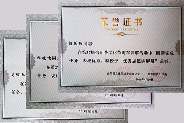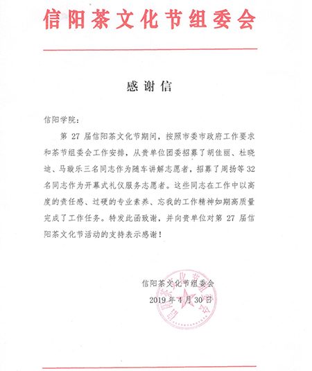 日前,信阳茶文化节组委会向我校发来感谢信,肯定我校志愿者在第27届信阳茶文化节期间的突出表现,并授予马璇乐等3名志愿者“优秀志愿讲解员”荣誉称号。