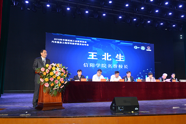 王北生致欢迎辞,向莅临本次会议的各位领导、专家和嘉宾表示热烈的欢迎和崇高的敬意。他简要介绍了信阳学院的办学历程和发展成果。他说,中国机械工业教育协会及汽车服务工程学科教学委员会汇聚了国内该领域顶级专家教授,在机械行业内具有广泛的影响力;长期以来,中国机械工业教育协会汽车服务工程学科教学委员会组织开展行业教育研究和交流,积极探索本学科发展规律,在开发人力资源,推动行业振兴等方面发挥了积极作用。信阳学院认真研究国家战略和区域发展需要,高度重视汽车服务工程学科发展,积极推进产教研融合,人才培养成绩斐然,汽车服务工程专业获批河南省高等学校专业综合改革试点项目,汽车技术实训中心获批河南省实验教学示范中心。此次年会首次在河南举行,并由信阳学院来承办,是我校集中学习借鉴兄弟院校先进办学理念和成功经验的大好机会。他表示,真诚希望各位专家学者对汽车服务工程学科的建设和发展积极建言献策,形成高水平研究交流成果,为我国从工程教育大国走向工程教育强国做出积极贡献。