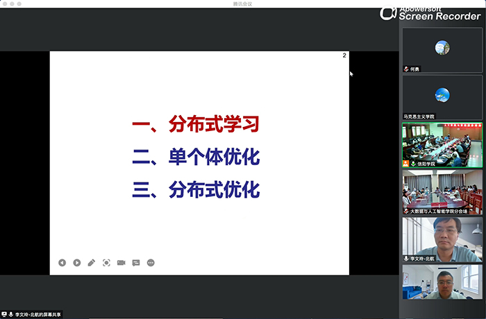9月15日,由人工智能学会主办、人工智能与智能服务专委会和信阳学院联合承办的“人工智能与智能服务”论坛以线上线下相结合的方式在学校人文楼208会议室隆重举办,北京航空航天大学李文玲教授受邀作了题为《分布式学习与优化》的学术报告。大数据与人工智能学院在数计楼407会议室设立线下分会场,我院200余名师生通过线上线下的形式聆听了报告。