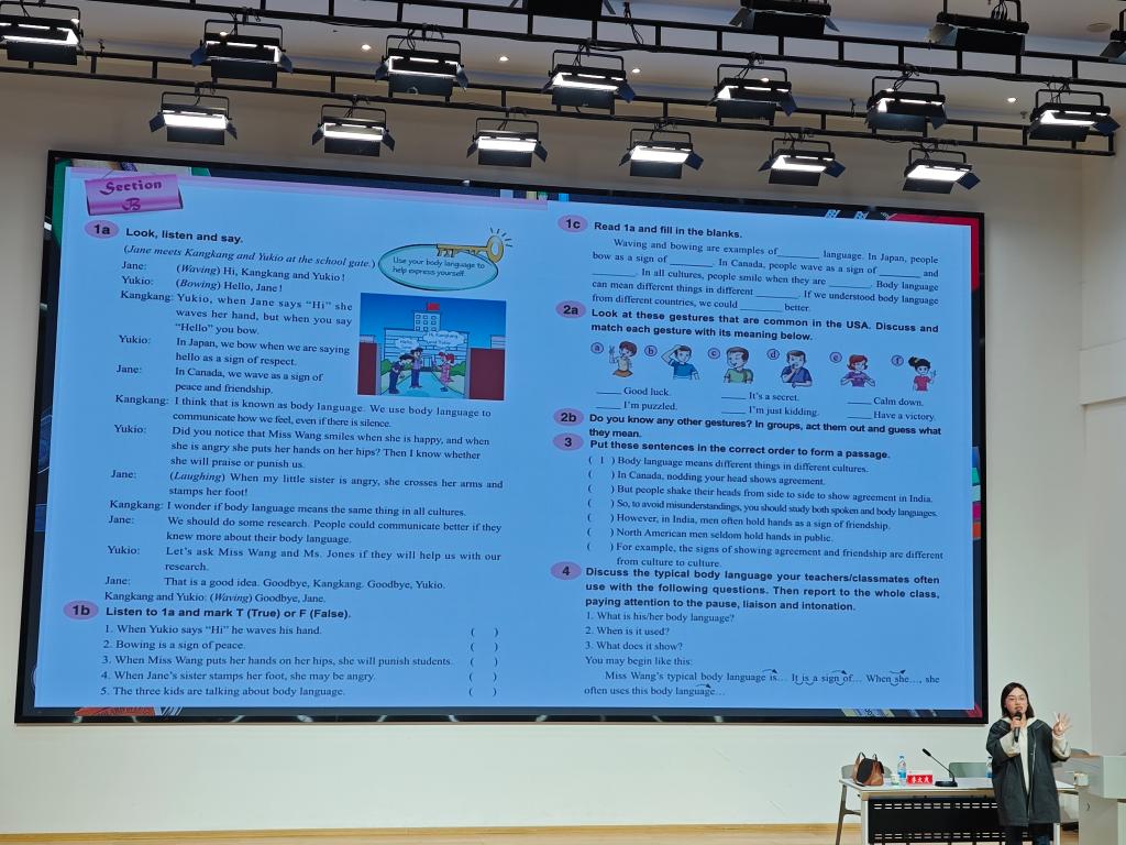 李文爽老师围绕“研读教材,明其逻辑”“分析课例,巧妙设计”“说课讲课,并非同一”三个板块展开分享。她详细解读旧版仁爱教材结构,并梳理各年级核心主题,如七年级“结交新朋友”“学校生活”,八年级“运动健康”“情绪调节”,九年级“全球英语”等,特别强调八年级是初中关键期,需兼顾学生心理关怀与知识教学。接下来,以九年级上册Unit 3 Topic 2 English Around the World听说课为例,拆解教学设计要点,通过创设文化冲突场景、融入信息技术、设计有效教学活动,激发学生兴趣,培养跨文化意识;同时提醒师范生,教学设计需避免套用模板,要融入个人思考,可通过设计项目式、探究式活动,让课堂更生动。
