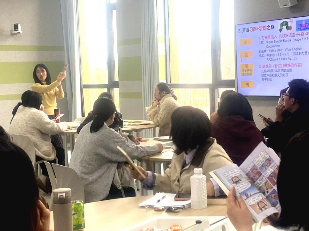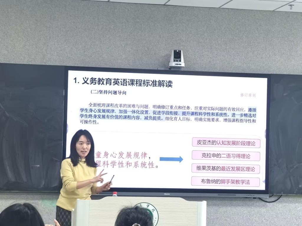 活动中,张孟杰老师紧扣中小学英语新课标要求,细致解读了教学原则、教学内容与教学提示,并深入阐释了其中蕴含的二语习得及英语教学理论。结合教学实践,他系统梳理出科学可操作的英语阅读进阶路径,还现场展示了从启蒙到高阶的系列阅读书籍。同时,她立足师范人才培养目标,提出在日常教学中融入新教学理念、着力提升师范生语言能力与教学能力的具体建议。