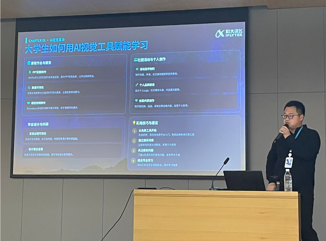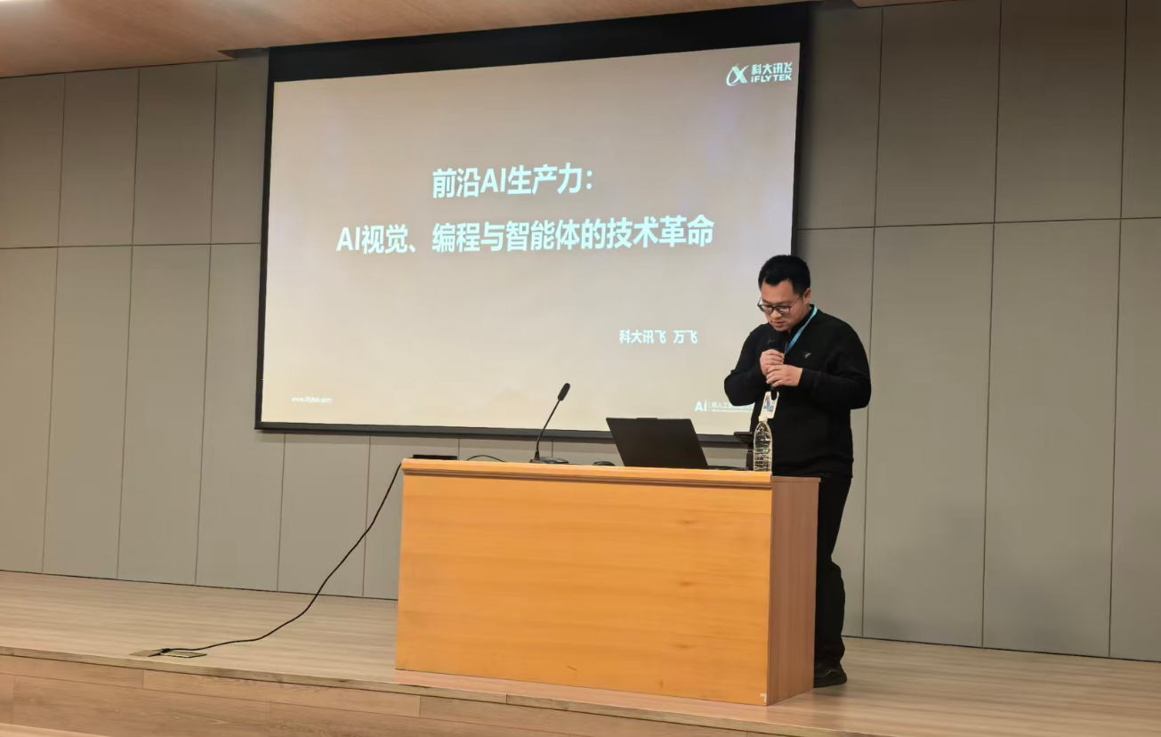 为紧跟人工智能技术发展前沿,进一步赋能学校专业教学创新,4月14日上午,计算机与人工智能学院特邀科大讯飞高级算法工程师万飞在浉河校区图书馆101报告厅作题为“前沿AI生产力:AI视觉、编程与智能通的技术革命” 的专题学术报告。全校200余名师生共同聆听了本次报告。报告由计算机与人工智能学院教学副院长毛凤翔主持。