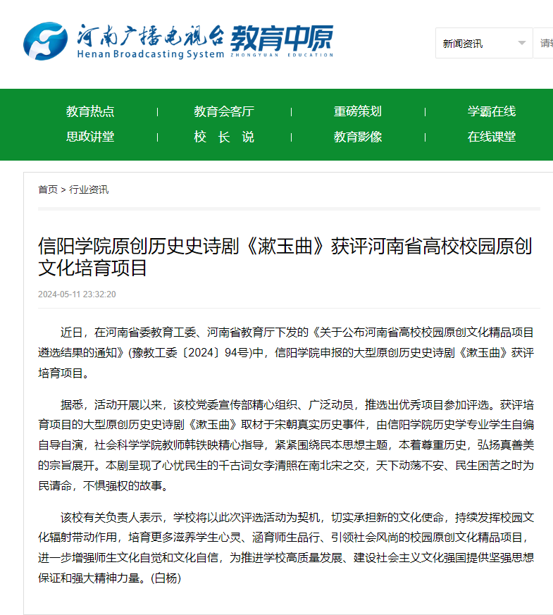 【河南广播电视台教育中原】信阳学院原创历史史诗剧《漱玉曲》获评河南省高校校园原创文化培育项目