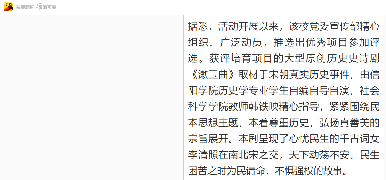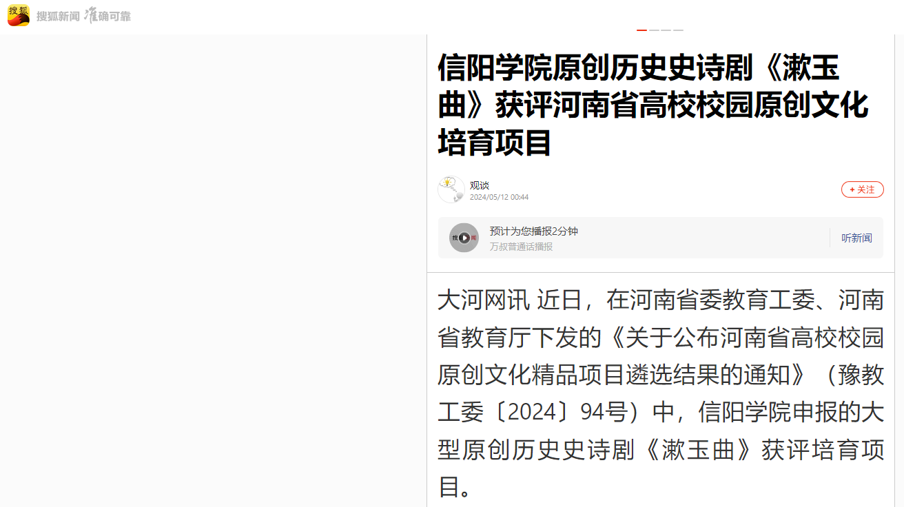 【搜狐新闻】信阳学院原创历史史诗剧《漱玉曲》获评河南省高校校园原创文化培育项目