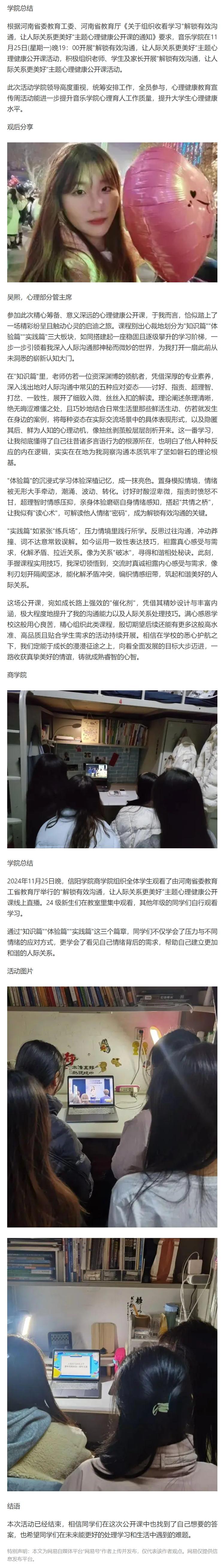 【网易新闻】信阳学院组织师生观看“解锁有效沟通,让人际关系更美好”主题心理健康公开课