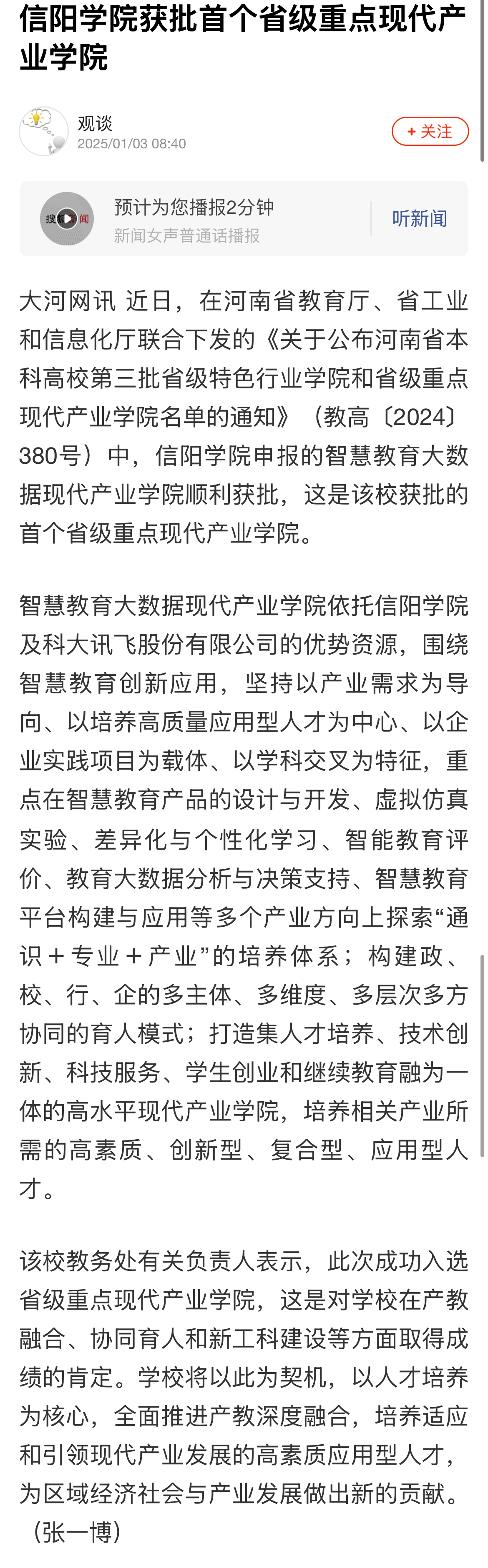 【搜狐新闻】信阳学院获批首个省级重点现代产业学院