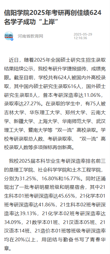 【大象新闻】信阳学院2025年考研再创佳绩624名学子成功“上岸”