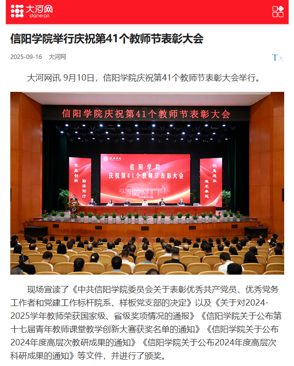 【大河网】信阳学院举行庆祝第41个教师节表彰大会
