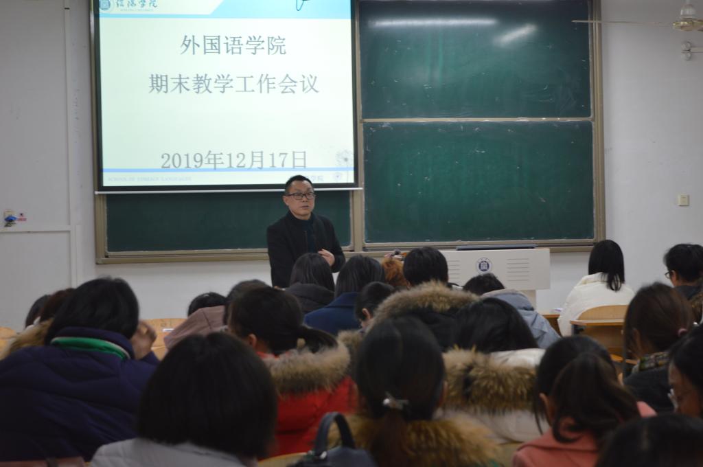 为进一步贯彻落实王北生校长在期末教学工作会议上的讲话精神,12月17日下午,外国语学院在外语楼202教室召开期末教学重点工作强调会。院长罗德喜,党总支书记李静,学工干事刘阳红,教学干事柳衡,行政干事梁书荣及全体教职工参加了此次大会。会议由李静主持。