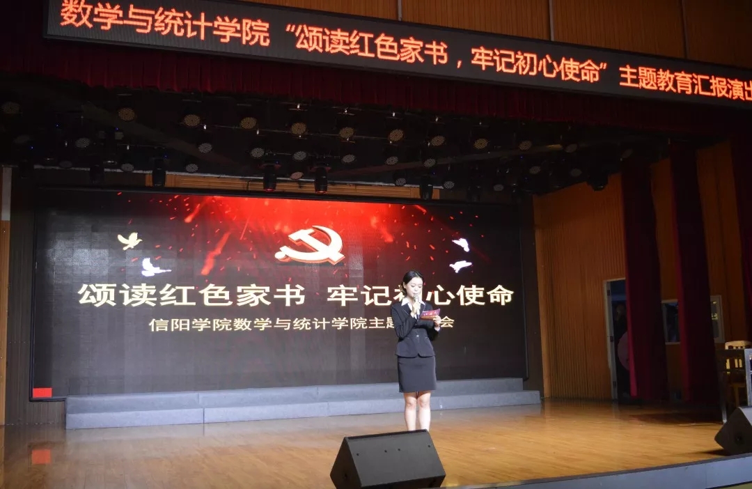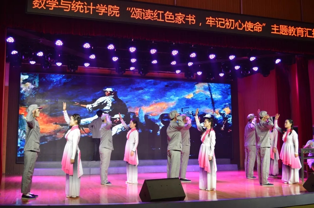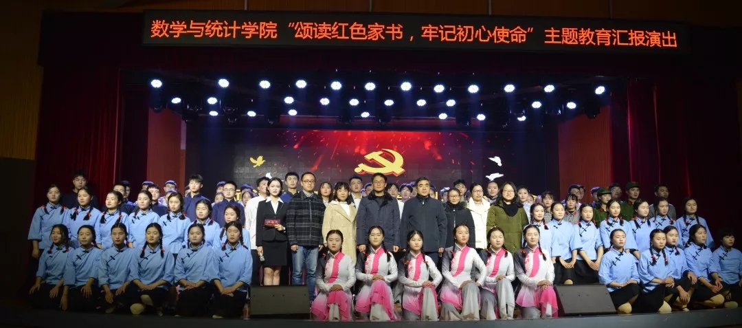 为深入推进“不忘初心、牢记使命”主题教育,增强教育感染力、感召力。12月19日,数学与统计学院在大学生活动中心开展“颂读红色家书,牢记初心使命”主题教育汇报演出。纪委书记、校长助理杨高伟、院长俞迎达、党总支副书记李平以及部分院系辅导员参加了此次汇报会。同学们将家书内容以角色扮演、情景重现、配乐颂读等形式展现出来,让大家从一封封饱含深情的家书中,感受到革命先烈的忠贞信仰、体会到无怨无悔的奉献与担当。