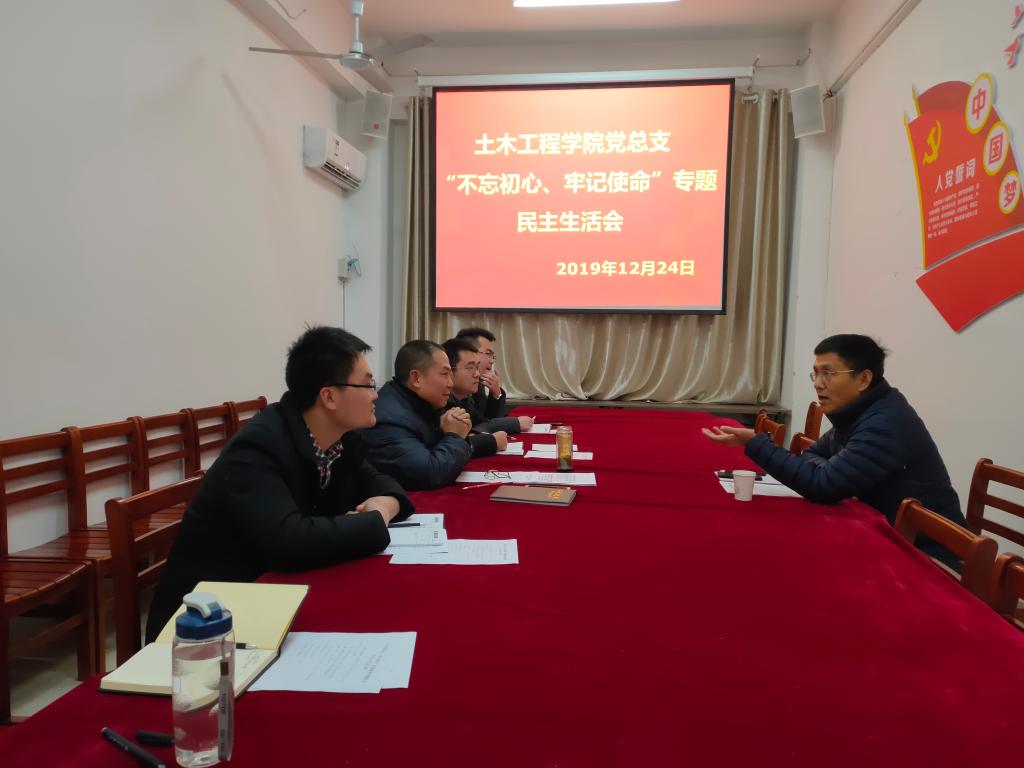 12月24日,土木工程学院党总支在理工楼112会议室组织召开了“不忘初心、牢记使命”专题民主生活会,校工会主席傅洪涛到会指导,学院党总支书记潘卫国及各总支委员参加了会议。会议由潘卫国主持。