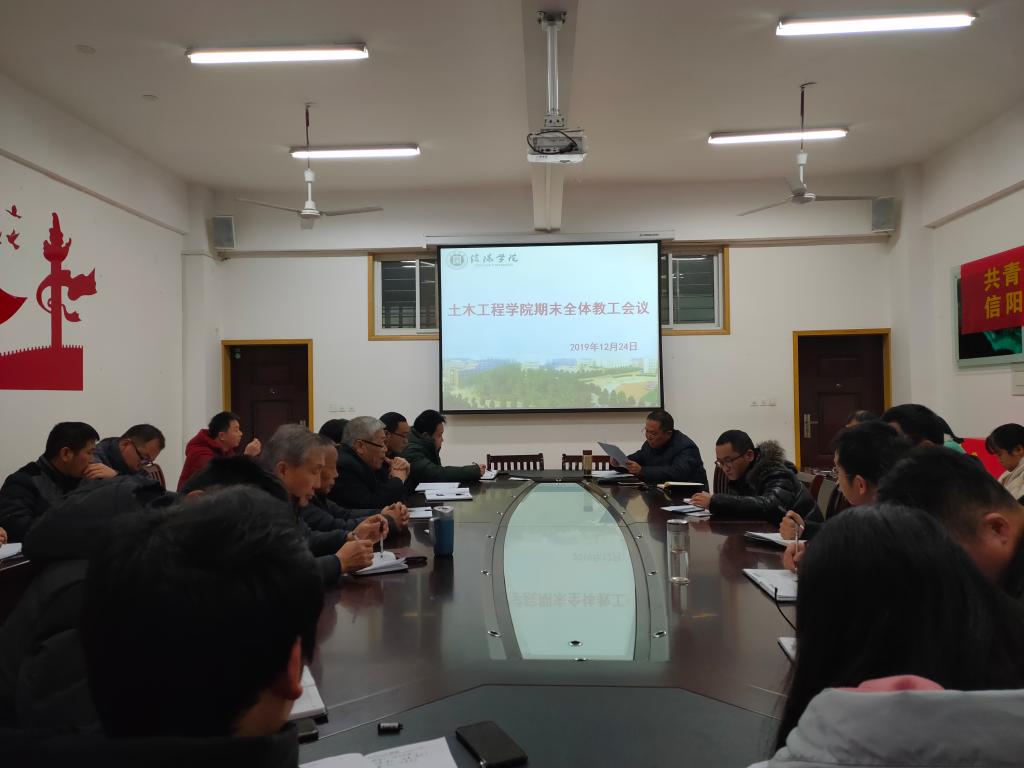 2019年12月24日下午,土木工程学院期末全体教工会议在理工楼201会议室召开。学院名誉院长、党总支书记潘卫国、行政秘书郗利选、教学干事王亮、学工干事徐超及学院全体教师参加了会议。会议由潘卫国主持。