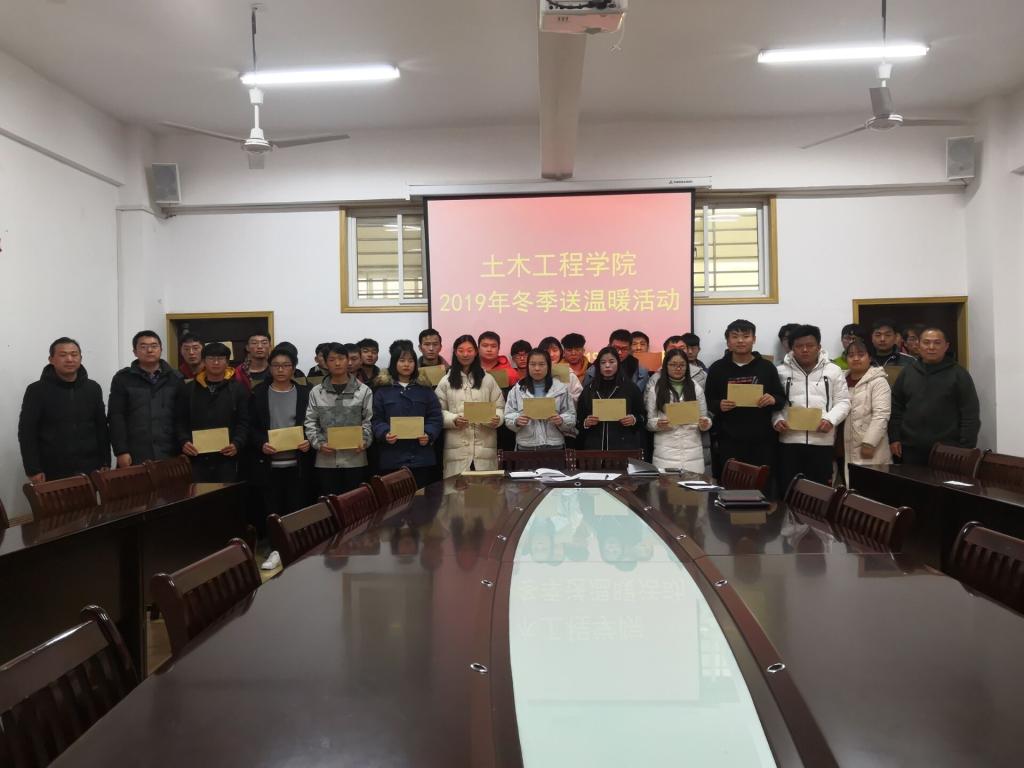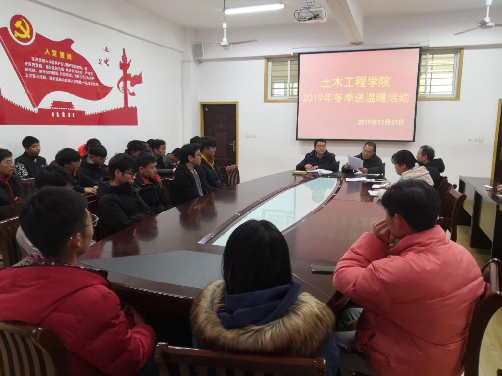 2019年寒假将至,土木工程学院根据《信阳学院关于做好寒假期间向家庭经济困难学生送温暖工作的通知》要求,组织导员认真摸排家庭经济困难学生情况,为帮助他们顺利返乡,度过一个温暖祥和的寒假。12月27日中午,土木工程学院在理工楼201会议室举行了冬季送温暖活动。院党总支书记潘卫国,学工干事徐超、全体辅导员及部分学生代表参加了活动。