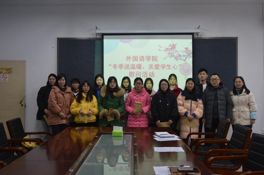 1月4日中午,外国语院在外语楼110举行“冬季送温暖,关爱学生心”慰问活动。外国语学院院长罗德喜,党总支书记李静,学工干事刘阳红老师,辅导员老师及受助的学生代表参加了此次活动。会议由李静主持。