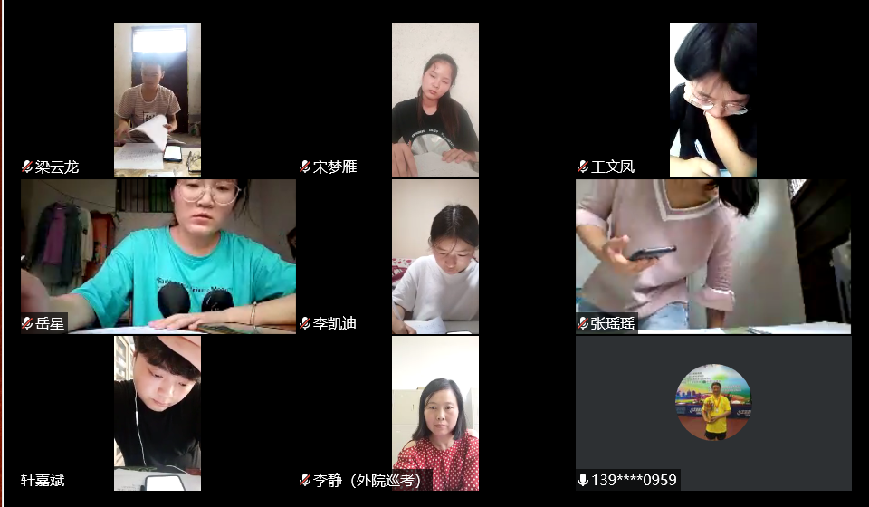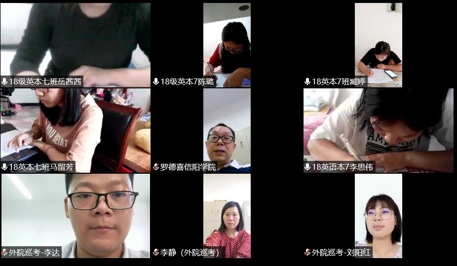 6月29日,外国语学院2019-2020学年第二学期期末线上考试工作全面展开,学院领导高度重视,上午8点,学校战略发展咨询委员会主任熊健民,外国语学院院长罗德喜,院党总支书记李静,教学工作负责人柳衡、李达,学工工作负责人刘阳红和行政工作负责人梁书荣通过腾讯会议对全院期末考试进行了线上巡考。
