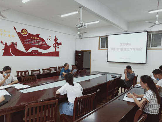7月2日上午,理工学院在理工楼201会议室召开评估材料工作会,理工学院院长肖生发教授、学工秘书杨晓杰、教学干事赵丹和各位教研室主任参加了会议。