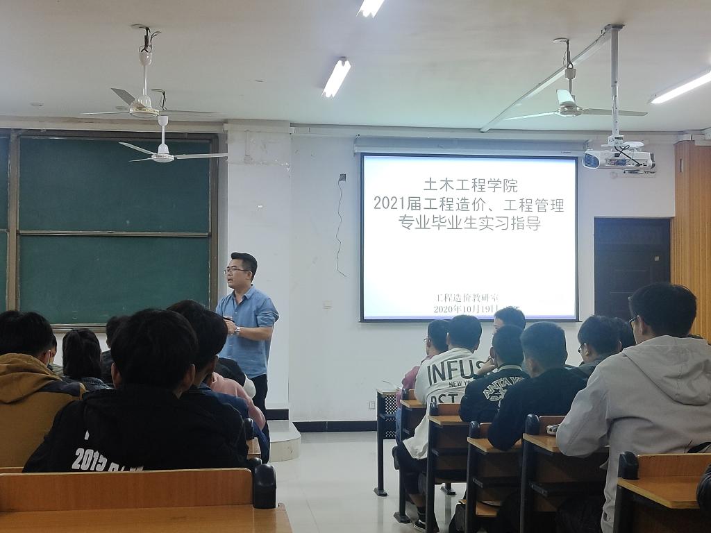 按照学校教务处《关于开展2021届本科毕业生实习工作的通知》的相关要求,为进一步做好2021届本科毕业生实习工作,10月19日晚上,土木工程学院工程造价教研室在人文楼106教室召开了2021届工程造价和工程管理专业本科毕业实习动员大会。工程造价教研室主任方超、博士生导师雷绍民教授、工程造价专业教研室其他专职老师及2017级工程造价和工程管理专业全体学生参加了会议,会议由教研室主任方超主持。